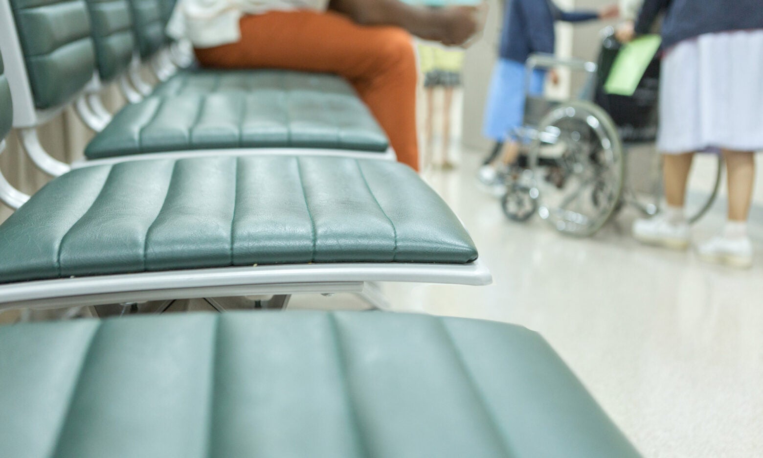 A man sits in a row of waiting room seats while nurses and wheel chairs move through a busy hallway at a hospital.